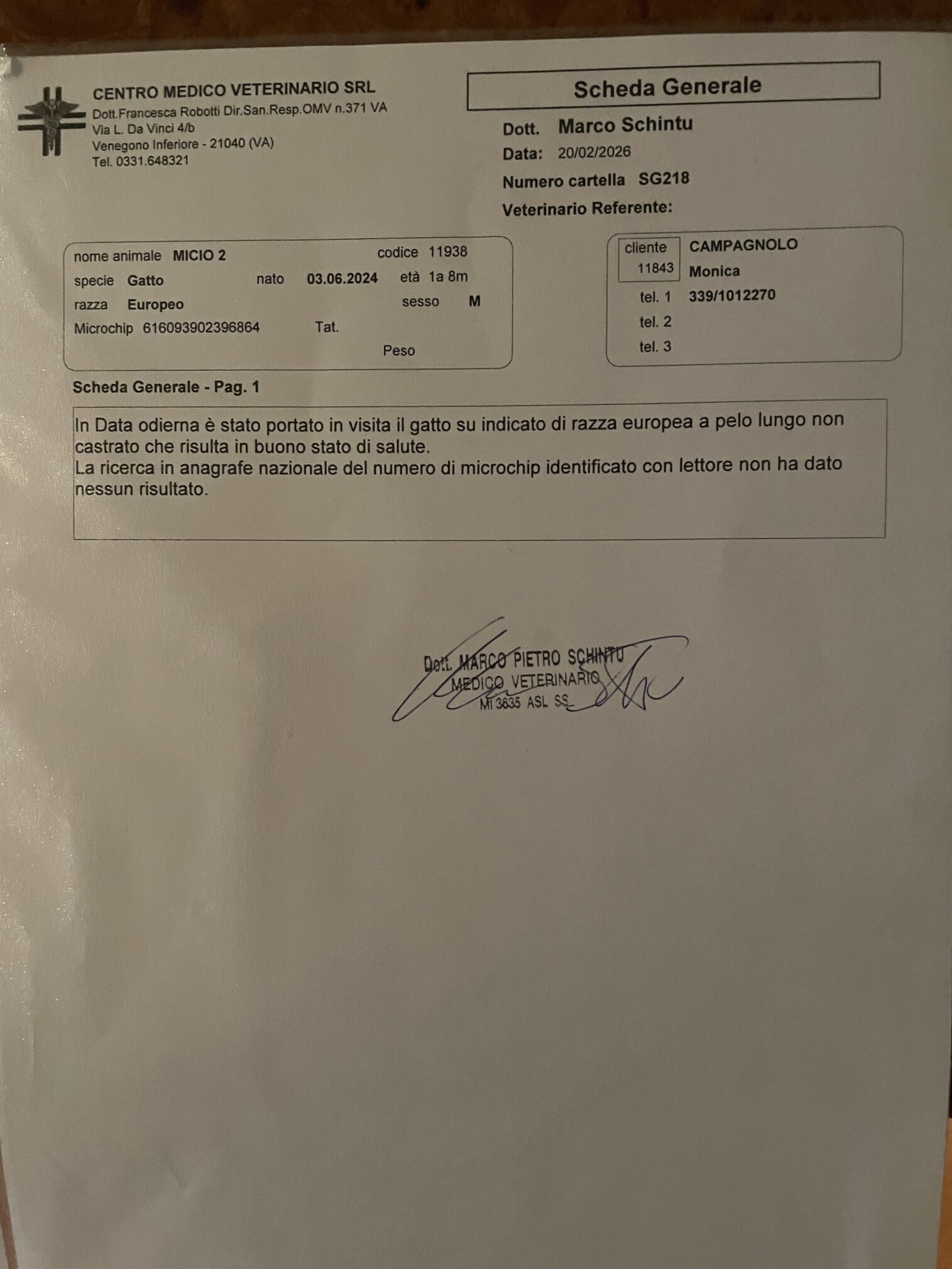 Il gatto ha un microchip probabilmente estero n. 616093902396864 a cui non è associato nessun nominativo, il microchip era in fase di regolarizzazione a mio nome (Monica Campagnolo) dopo di che andava sterilizzato.
